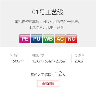 工藝要求 UV底漆、水性面漆 產(chǎn)品種類(lèi) 實(shí)木套房家具、電視柜、餐桌 產(chǎn)線數(shù)量 4條 設(shè)備特色 UV底漆快速干燥,水性面漆達(dá)到PU質(zhì)感。 生產(chǎn)產(chǎn)能 UV底漆噴涂線:1500m2/8h (生產(chǎn)員3人/線)