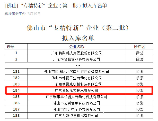 博碩根據(jù)《佛山市經(jīng)濟(jì)和信息化局關(guān)于開(kāi)展佛山市“專(zhuān)精特新”企業(yè)(第二批)入庫(kù)的通知》(佛經(jīng)信函[2018]2143號(hào))的要求,按照公開(kāi)、公平、公正的原則,積極主動(dòng)申報(bào)、服務(wù)機(jī)構(gòu)審核推薦、專(zhuān)家組評(píng)審等環(huán)節(jié)有幸擬入庫(kù)佛山市“專(zhuān)精特新”企業(yè)(第二批)名單。