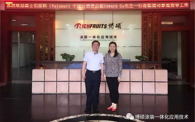七月的盛夏,瓦藍(lán)色的天空沒(méi)有一絲的彩云,火熱的太陽(yáng)炙烤著大地,這么悶熱的天氣還是阻擋不了博碩那熱辣辣的心,有幸在今天博碩迎來(lái)威士伯涂料(Valspar)中國(guó)區(qū)銷(xiāo)售總監(jiān)Edward Gu先生帶著威士伯強(qiáng)大的精英團(tuán)隊(duì)蒞臨我司參觀指導(dǎo)工作。包括UV、水性UV、水性漆研發(fā)老總以及各產(chǎn)品的老總及各區(qū)域市場(chǎng)部的老總。個(gè)個(gè)都是化工專(zhuān)業(yè)的高級(jí)精英人士。