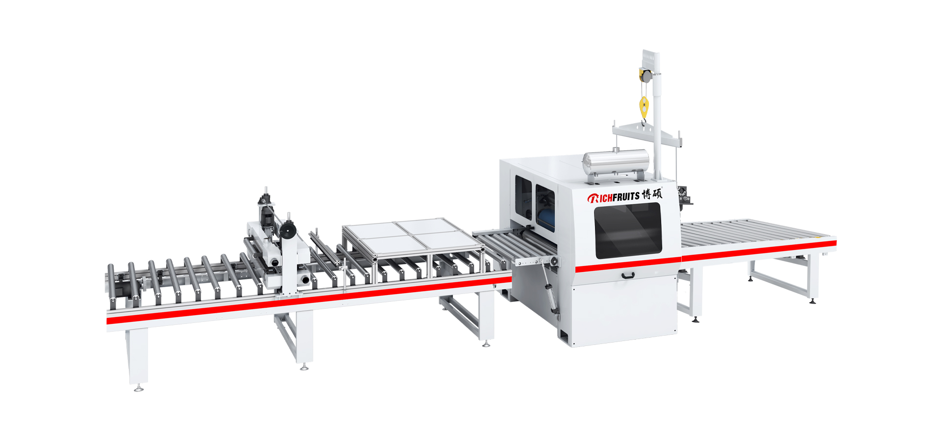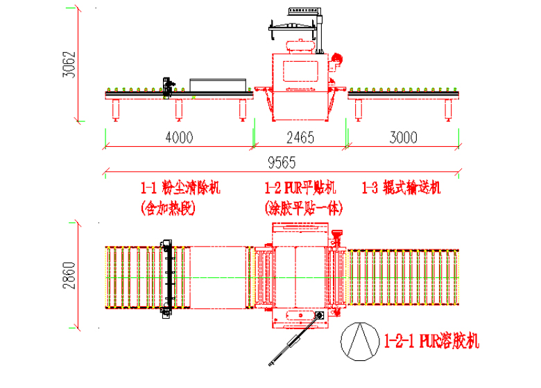 粉塵清除機(jī) — PUR平貼機(jī)(含溶膠系統(tǒng)) — 輸送機(jī)等部分組成。