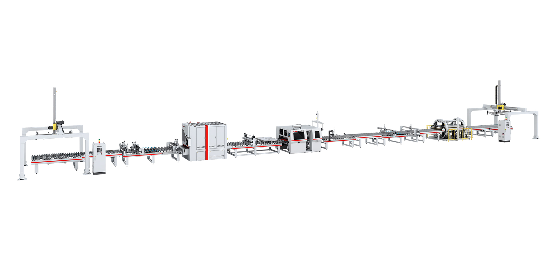 本生產(chǎn)線由:龍門上下料機 — 對中輸送機 — 輸送機 — 倒角機 — 砂光機 — 粉塵清除機 — PUR平貼機(含溶膠系統(tǒng)) — 斜切機 — 輸送機一精密修邊機 — 輸送機 — 圓筒式翻板機 — 對中輸送機 — 龍門上下料機等部分組成。