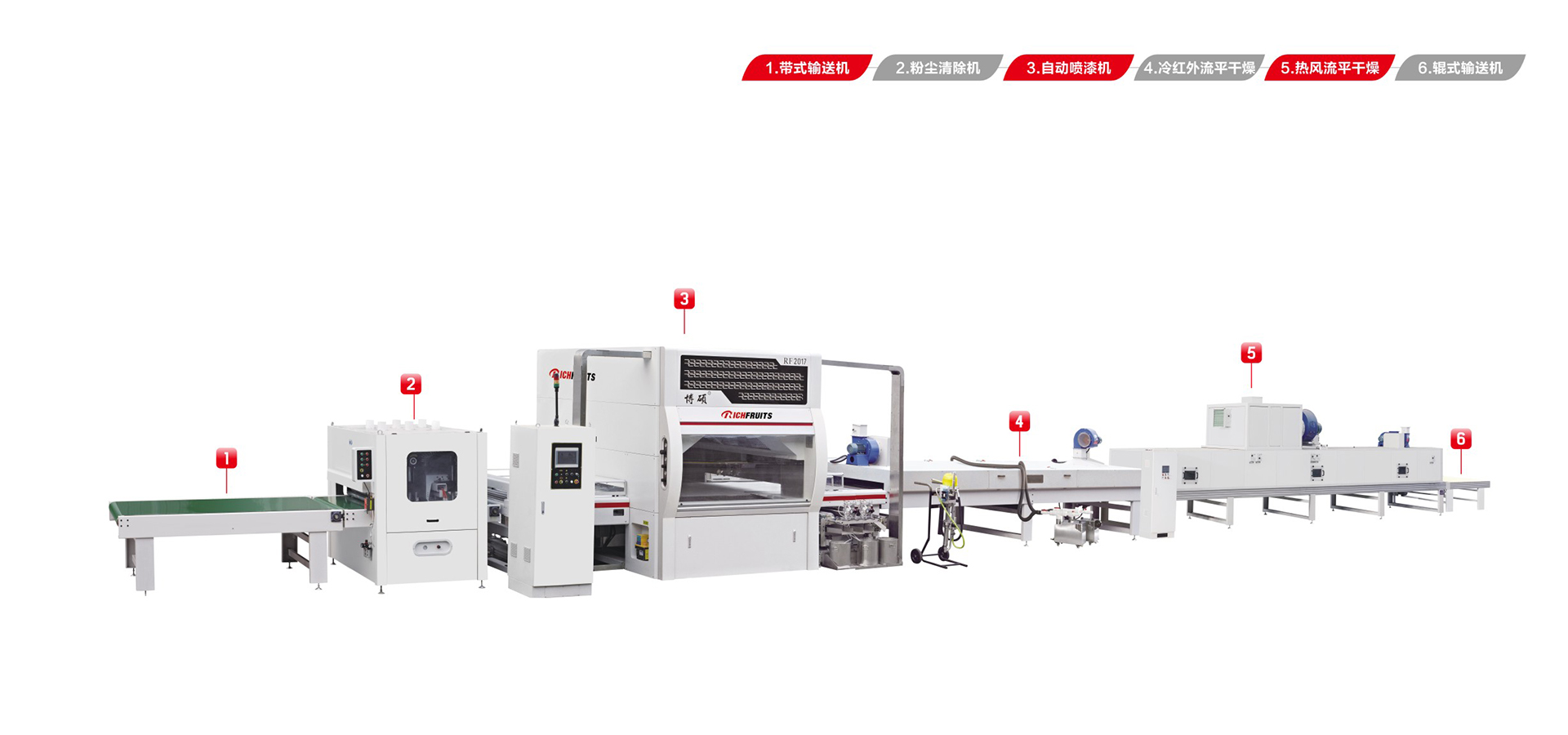 適用于板式家具、實木門、櫥柜門、工藝品、裝飾板、硅酸鈣板、玻鎂板、水泥纖維板的板式加工件的平面和四個側邊進行高質(zhì)量、大批量連續(xù)噴漆。
